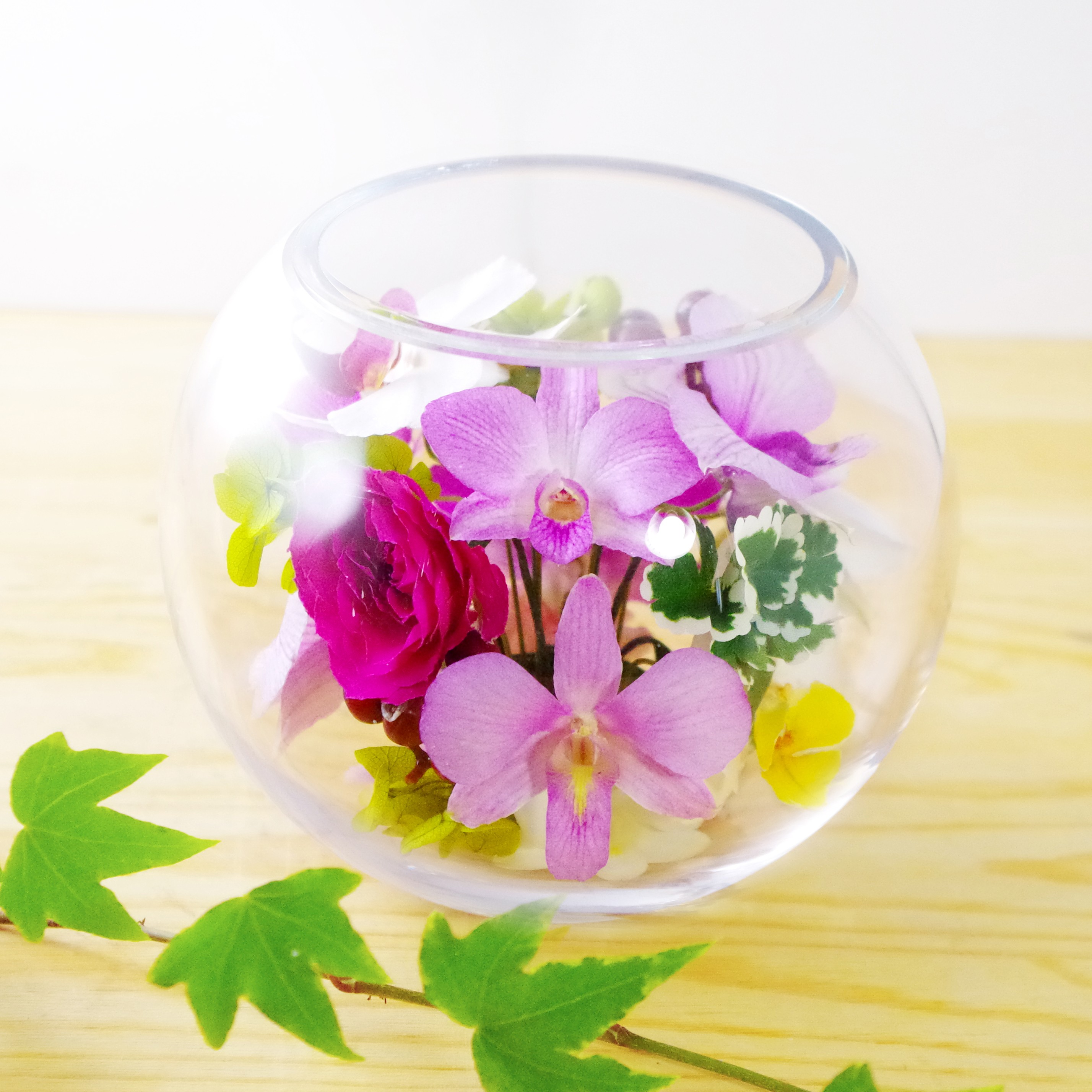 | 容量 | 使用花材【胡蝶蘭、デンファレ、バラ、グリーン】 ガラスのサイズ 幅11.5㎝×高さ13.5㎝ 丸型ボトルフラワー、お手入れの手引書、専用ケース・ラッピング付き |