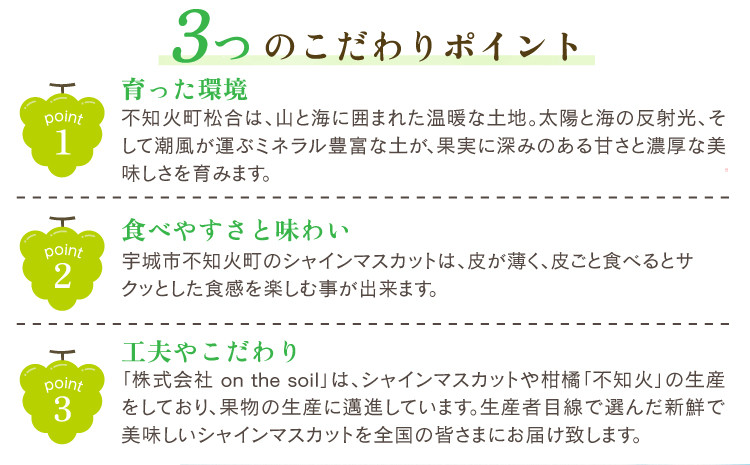 潮風薫る宇城市不知火町のシャインマスカットは、皮が薄く、皮ごと食べるとサクッとした食感を楽しむ事が出来ます。