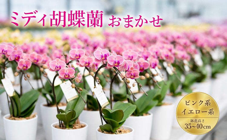 熊本県宇城市戸馳産のコンパクトで可愛いミディ胡蝶蘭。観賞用、贈り物でもおすすめ ミディ胡蝶蘭 おまかせ 35~40鉢 4号 2本立ち ピンク系 イエロー系 胡蝶蘭 コチョウラン こちょうらん プレゼント ギフト 観賞用 蘭 らん ラン 植物 花