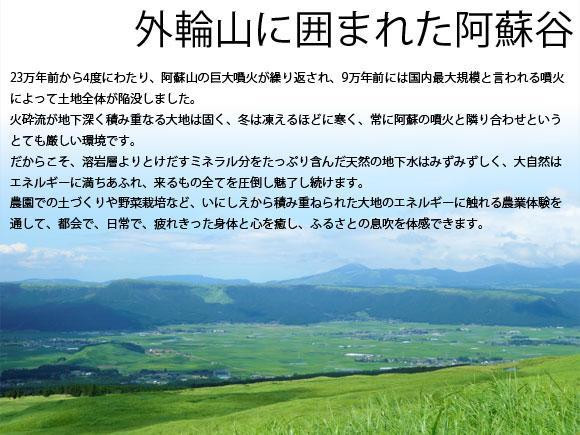 23万年前から4度にわたり、阿蘇山の巨大噴火が繰り返され、9万年前には国内最大規模と言われる噴火によって土地全体が陥没しました。火砕流が地下深く積み重なる大地は固く、冬は凍えるほどに寒く、常に阿蘇の噴火と隣り合わせというとても厳しい環境です。だからこそ、溶岩層よりとけだすミネラル分をたっぷり含んだ天然の地下水はみずみずしく、大自然はエネルギーに満ちあふれ、来るもの全てを圧倒し魅了し続けます。農園での土づくりや野菜栽培など、いにしえから積み重ねられた大地のエネルギーに触れる農業体験を通して、都会で、日常で、疲れきった身体と心を癒し、ふるさとの息吹を体感できます。