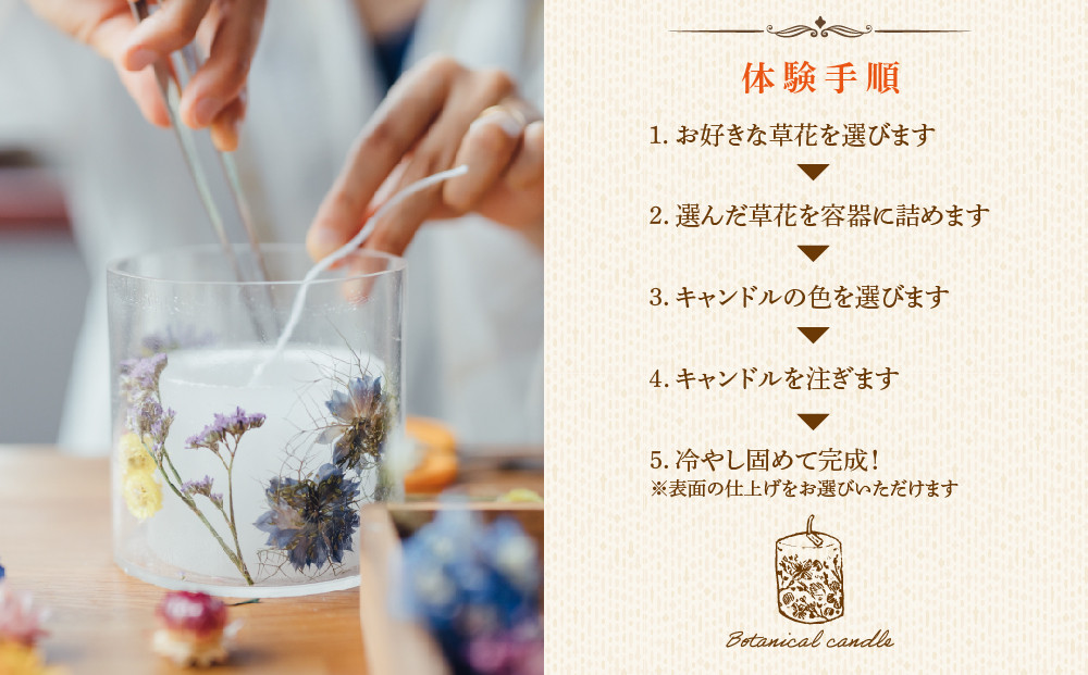 熊本・阿蘇で育ったお花を中心としたドライフラワーを使ってボタニカルキャンドルの制作体験を行なっていただけます。