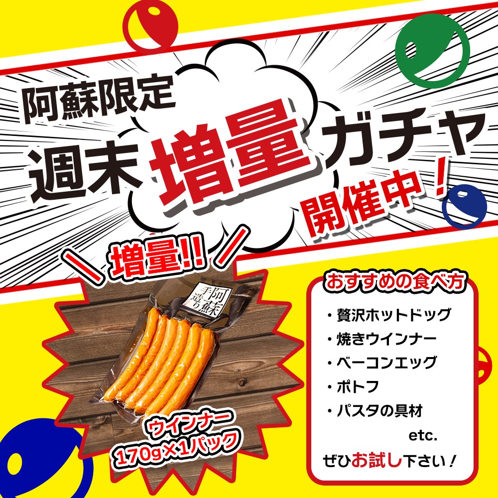| 容量 | ■内容 ・ウインナーソーセージ 170gx4(長さ約20cm ※手造りのため若干の差異がございます。) ■加工地 ・熊本県阿蘇市 ■栄養成分 100g当たり エネルギー270kcal、たんぱく質16.1g、脂質21.9g、炭水化物2.1g、食塩相当量2.1g |