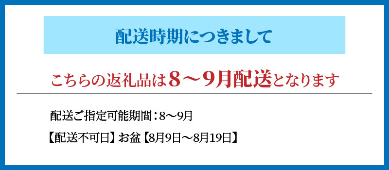 指定可能期間:8~9月 ※お届け日指定必須のお礼品です。 賞味期限が短い返礼品のため日にち指定にてお送りいたします。 入金日より20日以降でのお受取りご希望日を、ご寄附画面「お礼の品のお届け先」より指定をお願いいたします お申込みのタイミングによっては、次期でのお届けになる場合がございます ※配達時間の指定は14時以降より可能(午前中の指定不可) ※天候や配送状況によっては、お届けが前後する場合やご変更いただく場合もございますので予めご了承の上、お申し込みください。 【配送不可日】 お盆(8月9日~8月19日) |