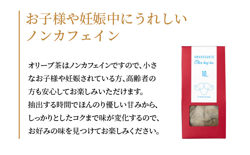また、オリーブ茶はノンカフェインですので、小さなお子様や妊娠されている方、高齢者の方も安心してお楽しみいただけます。