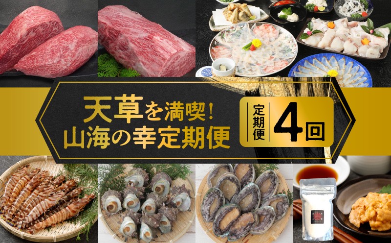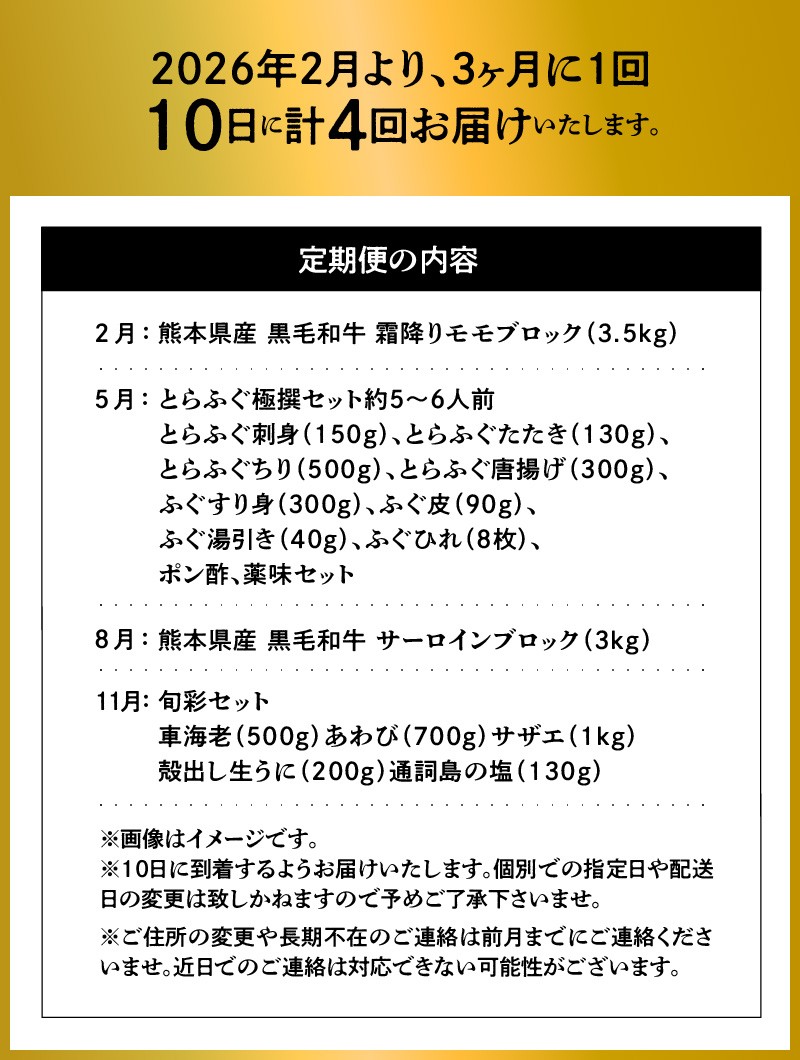 定期便,4回,牛肉,黒毛和牛,霜降りモモ,3.5kg,ふぐ,とらふぐ,サーロイン,ブロック肉,3kg,ステーキ,車海老,あわび,サザエ,殻出し,生うに,天草,天然塩,旬