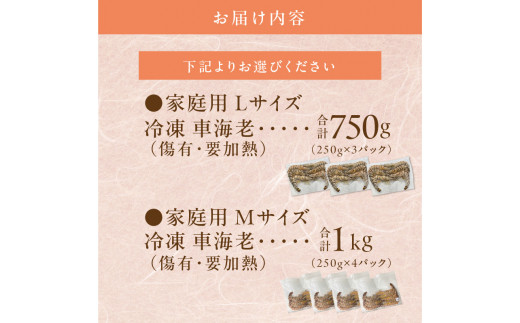 車海老,250g×3,250g×4,合計750g,1000g,5~7尾,Mサイズ,Lサイズ,家庭用,初めての方にオススメ,冷凍,傷有,要加熱,天草産,えび,扱いやすい,真空パック,小分け,便利,魚介類,海産物,海の幸,塩焼き,天ぷら,九州,熊本県,天草市