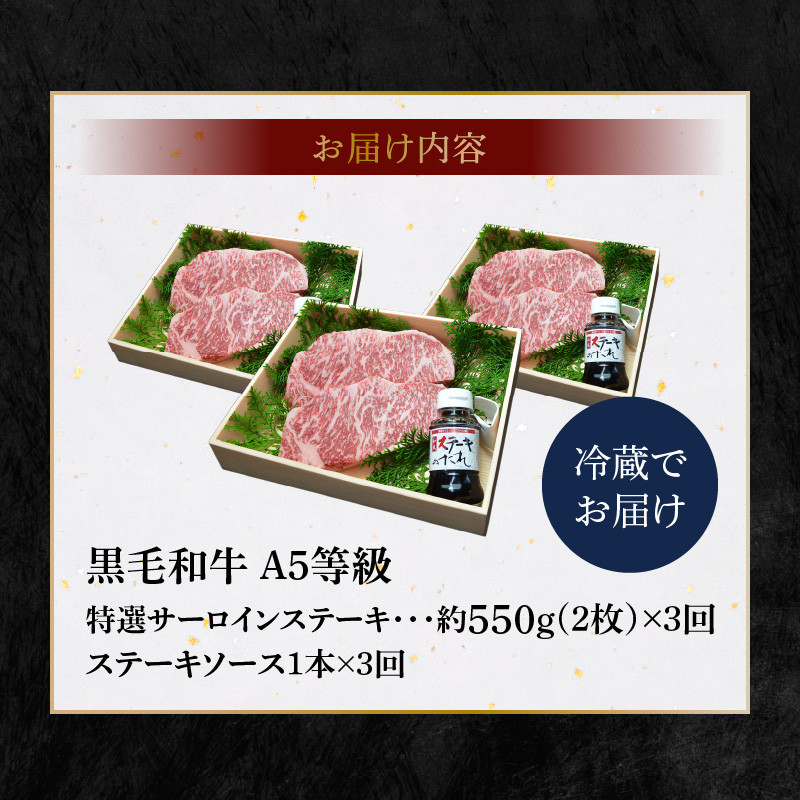 定期便 3回 3ヵ月 黒毛和牛 特選 サーロイン ステーキ A5 ランク たれ付き 国産 牛肉 2枚セット 約550g 約1.65kg 柔らかい 肉 牛 和牛 食品 食べ物 ごはんのおとも 冷蔵 田中畜産 たなか畜産 九州 熊本県 天草市 冷蔵 指定日 お取り寄せ お取り寄せグルメ 送料無料