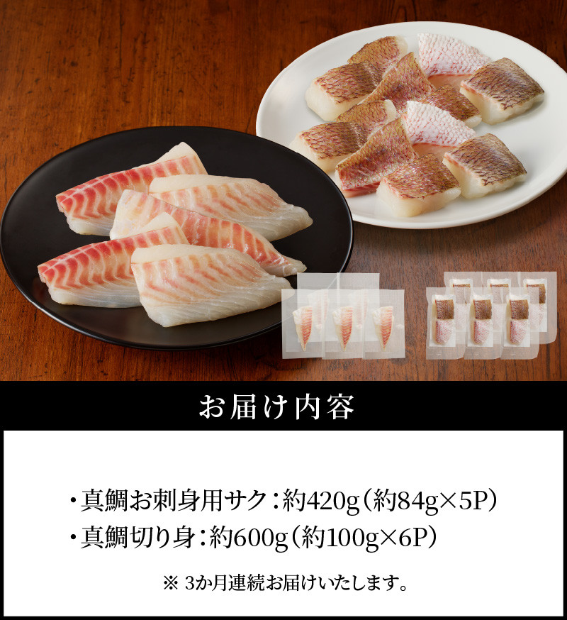 | 容量 | 真鯛の切り身2切入り100g×6パック 真鯛のお刺身用サク5パック(計420g) ※ 3か月連続お届けいたします。 【注意事項】 ※画像はイメージです。 ※配送日の指定はできません。 ※天候や自然災害、配送状況などの影響により、発送が遅れる場合があります。 ※ご寄附者様の都合により返礼品を受け取れなかった場合、または受け取りまでに時間がかかった場合の再配送は致しかねます。 ※長期でのご不在や住所の変更は、配送予定の3週間前までにご連絡ください。出荷準備に入りますと配送時期や住所の変更は出来かねます。 ※転送される場合は、直接配送業者へご連絡ください。送り状記載のお届け先から転送先までの送料を着払いにてご負担いただきます。予めご了承ください。 |