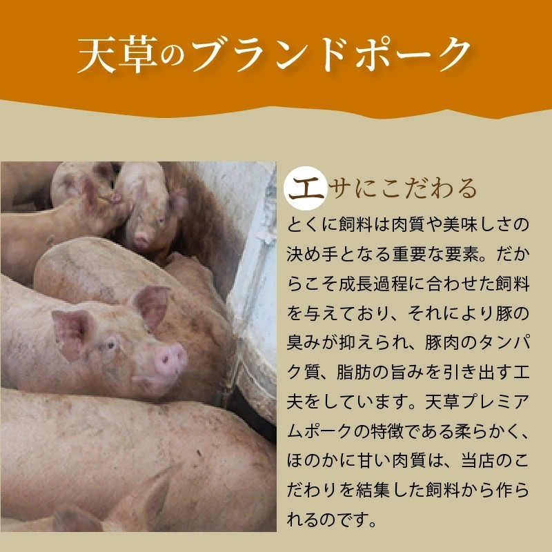 オリジナルブランド豚「天草プレミアムポーク」は、驚くほど柔らかい肉質に加えて、あっさりとした脂分とほのかな甘みが特徴です。「臭みがなくて、いくらでも食べられる」とリピーター様からもご好評を頂いております。