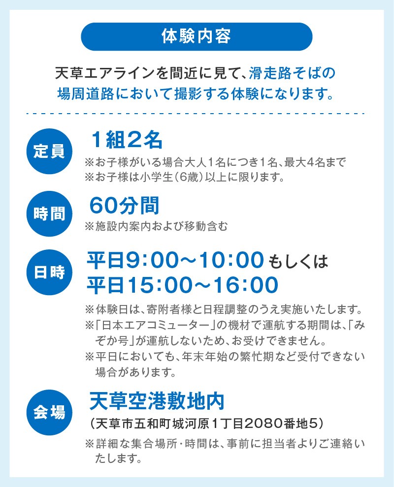 ※体験日時に天候などにより、天草エアラインが欠航や遅延が生じる場合があります。あらかじめご了承ください。