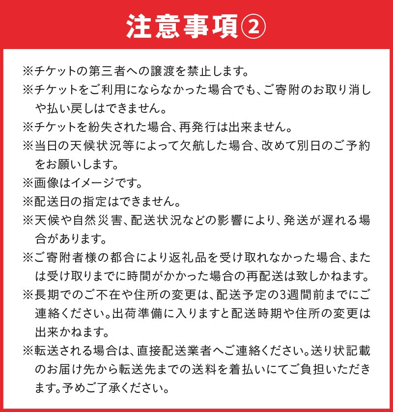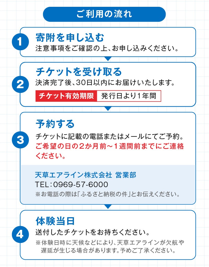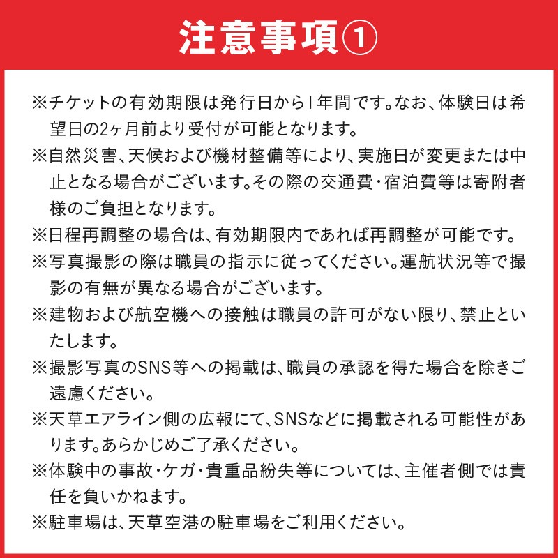 ご寄附の入金を確認後、原則として30日以内に発送します。 ※ただし、人気のお礼品などは、発送までに1~3ヶ月程度お時間をいただく場合があります。 【注意事項】 ※体験日は、寄附者様と日程調整のうえ実施いたします。 ※お子様は小学生(6歳)以上に限ります。但し、保護者1名に対し1名迄参加可能です。 ※チケットの有効期限は発行日から1年間です。なお、体験日は希望日の2ヶ月前より受付が可能となります。 ※自然災害、天候および機材整備等により、実施日が変更または中止となる場合がございます。その際の交通費・宿泊費等は寄附者様のご負担となります。 ※「日本エアコミューター」の機材で運航する期間は、お受けできません。 ※日程再調整の場合は、有効期限内であれば再調整が可能です。 ※体験時間は60分程度を予定しております。 ※写真撮影の際は職員の指示に従ってください。運航状況等で撮影の有無が異なる場合がございます。 ※建物および航空機への接触は職員の許可がない限り、禁止といたします。 ※撮影写真のSNS等への掲載は、職員の承認を得た場合を除きご遠慮ください。 ※天草エアライン側の広報にて、SNSなどに掲載される可能性があります。あらかじめご了承ください。 ※体験中の事故・ケガ・貴重品紛失等については、主催者側では責任を負いかねます。 ※詳細な集合場所・時間は、事前に担当者よりご連絡いたします。 ※駐車場は、天草空港の駐車場をご利用ください。 ※撮影体験チケットの第三者への譲渡を禁止します。 ※撮影体験チケットをご利用にならなかった場合でも、ご寄附のお取り消しや払い戻しはできません。 ※撮影体験チケットを紛失された場合、再発行は出来ません。 ※当日の天候状況等によって欠航した場合、改めて別日のご予約をお願いします。 |