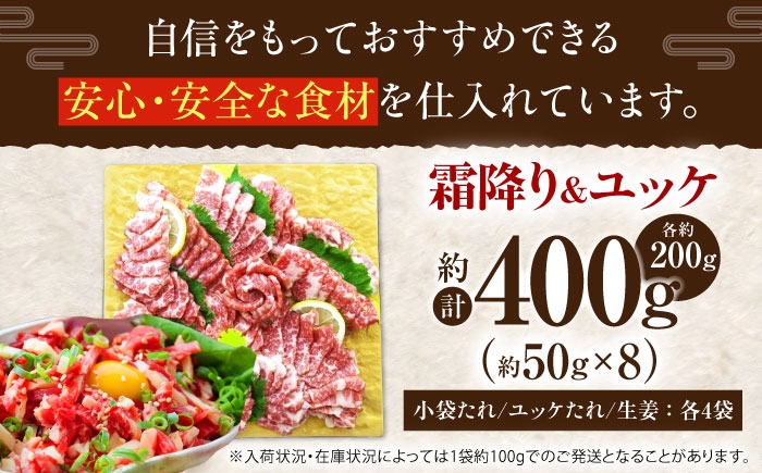 本場熊本から産地直送!おいしい馬刺しをお届けします。 熊本 馬刺し 霜降り (大トロ) 約200g+ 馬肉ユッケ 約200g 合計約400g / 馬刺 ばさし ユッケ ゆっけ バサシ 霜降り しもふり 馬肉 桜肉 トロ お肉 セット【くまもと食彩の力】[AYAN007]