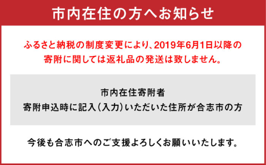・合志市在住の方の寄附に関しては返礼品の発送は致しません。