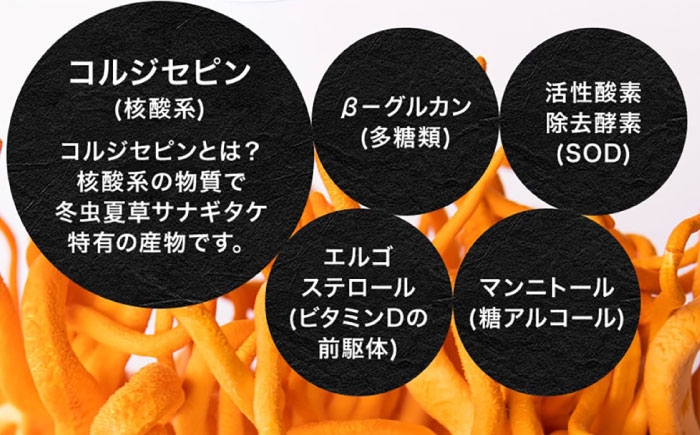 主原料の冬虫夏草サナギタケ粉末は100%合志市で生産されたもの。