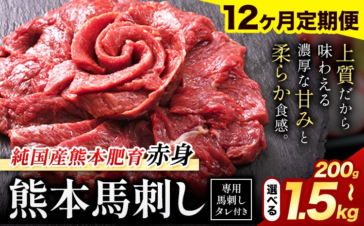 安心安全【熊本肥育】濃厚な甘みと柔らか食感 【12ヶ月定期便】馬刺し 赤身 馬刺し 選べる内容量 200g 300g 400g 500g 1kg 1.5kg【純 国産 熊本 肥育】たっぷり タレ付き 生食用 冷凍《お申込み月の翌月から出荷開始》送料無料 国産 絶品 馬肉 肉 ギフト 定期便