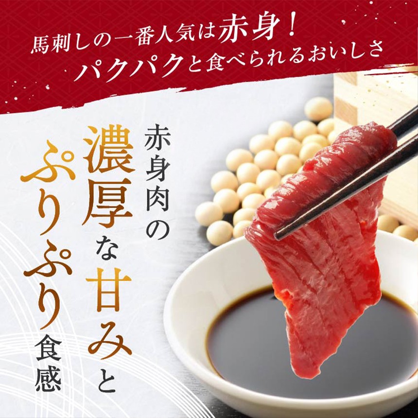 国内肥育 熊本発送 馬刺し 赤身 500g 馬刺し醬油・生姜付き 【飼育】 熊本の広大な敷地に、約500頭の馬がのんびりと暮らしています。 馬を健康な状態に保つ工夫を随所に取り入れています。馬が体調を崩しやすいのは夏。暑さに弱い馬は、食欲が落ちがちです。飼料を季節ごとに変更して、食欲が落ちても栄養がとれる飼料配合を行っています。 また、厳しい暑さを乗り切るための方法として、天然の地下水をスプリンクラーで馬にかけるといった対策をしています。飲料水としても使える、清らかで冷たい天然水を浴びることで、馬たちは夏を涼しく過ごしているのです。 馬が健康でいられるのは、経験豊富なスタッフ全員がしっかりと馬を見ていること、そして細やかな工夫のおかげです。 【安心・安全は徹底した管理】 プロが育てる健康な馬だけを、最適な時期に製品化。一貫生産のため、出どころも肥育状況も明確です。 生で食べる「馬刺し」は、絶対の安全性がなければ提供ができません。そのため、くまもと食彩の力のモットーは「自分の子どもに食べさせられる品質」です。 【馬刺しの美味しいお召し上がり方】 ■盛り付け 玉ねぎスライスの上に大葉を置き、切った馬刺しを並べます。薬味に、すりおろしたニンニクとショウガを添えて完成!熊本特有の、甘くとろりとした醤油(付属)と一緒にお召し上がりください。 ※真空包装の開封後は、お早めにお召し上がりください。 【原材料】・馬肉 ・醤油:アミノ酸液、醤油(小麦、大豆を含む)、果糖ぶどう糖液糖、米発酵調味料、砂糖、水飴、食塩/カラメル色素、アルコール、調味料(アミノ酸等)、甘味料(甘草、サッカリンNa)、増粘剤(キサンタンガム)、保存料(パラオキシ安息香酸) ・生姜 【産地】 国内産またはカナダ産※国内肥育 【と畜場】(株)熊本中央食肉センター ※注意事項 ・画像はイメージです。 ・開封後はなるべく早くお召し上がりください。(馬刺しの場合はその日のうちにお召し上がりください)