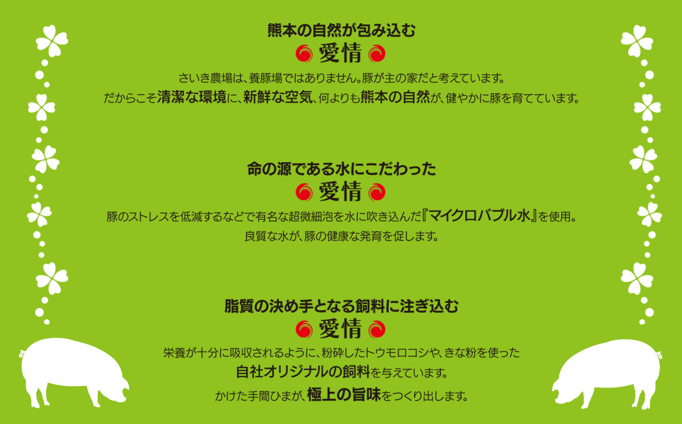 熊本の自然に包まれ清潔な環境で育てられた豚たちは、新鮮な空気と自社オリジナルの飼料、そして良質な水に育まれています。