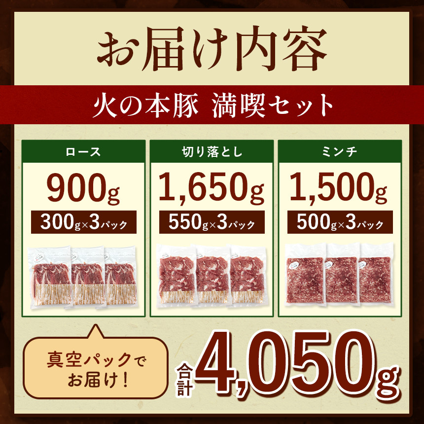 <【定期便6回】火の本豚 満喫セット(ロース、切り落とし、ミンチ) 4050g>