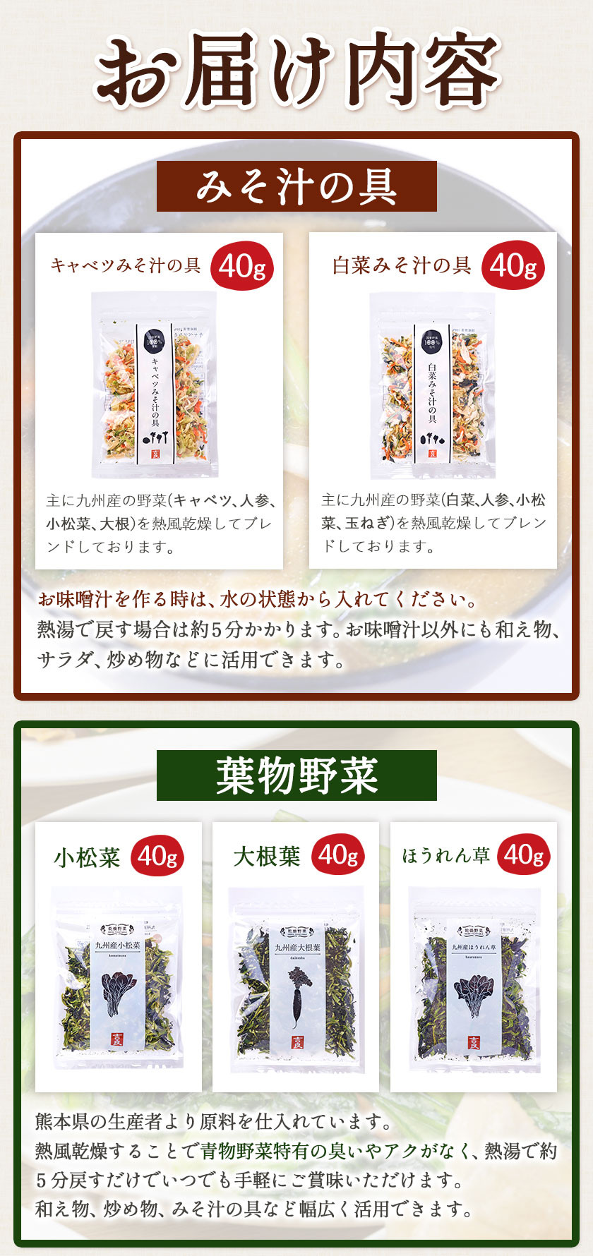 | 容量 | ・キャベツみそ汁の具 40g ・白菜みそ汁の具 40g ・九州産小松菜 40g ・九州産大根葉 40g ・九州産ほうれん草 40g ・九州産ごぼう 35g ・乾燥野菜ミックス(切干し大根・にんじん・大根葉) 27g ・乾燥野菜ミックス(ごぼう・にんじん・れんこん) 45g |