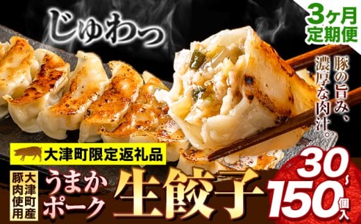大津町限定返礼品!豚の旨み、濃厚な肉汁が詰まったうまかポーク生餃子! 【3ヶ月定期便】餃子 うまかポーク生餃子 タレ付き 大津町限定返礼品 冷凍餃子 ギョウザ 大津町産豚肉使用 九州産キャベツ使用(大津町産含む)皮モチモチ 肉汁溢れる ぎょうざ 30個 60個 90個 150個 《お申込み月の翌月から出荷開始》