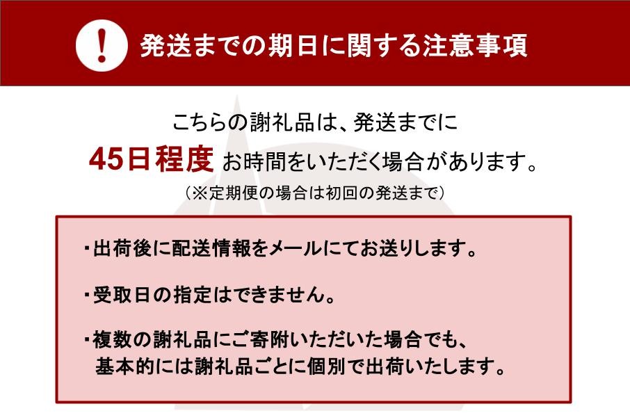 寄附完了後、45日以内に発送いたします。 出荷後はメールにて通知いたしますのでメールが届くまでお待ちください。 出荷時期に長期不在等がある場合は備考欄にご入力ください。 × 配送日、出荷時期の指定不可 【他謝礼品を含む複数の品をお選びの場合でも、品毎に出荷いたします。】 |