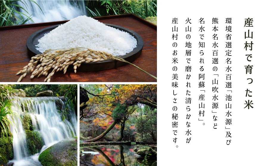 環境省認定名水百選「池山水源」及び熊本名水百選の「山吹水源」の水を使用し、育てたうぶやま産のお米です。