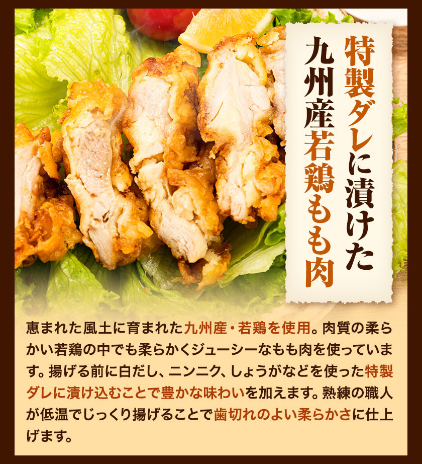 鶏肉(九州産)、ミックス粉(小麦粉、でん粉、米粉、粉末状大豆たん白、とうもろこし粉、植物油脂、コーンシロップ、ゼラチン)、揚げ油(植物油脂)、にんにく、生姜、食塩、たん白加水分解物、米発酵調味料、佐藤、しょうゆ、かつおエキス、醸造酢、合わせだし(煮干いわし、さば節、かつお節)、酵母エキス、昆布エキス/加工でん粉、膨張剤、乳化剤、着色料(カロチン)、カゼインナトリウム、酸化防止剤(トコフェロール)、アルコール、調味料(アミノ酸等)、シリコーン、酒精、pH調整剤、増粘材(キサンタン)、(一部に大豆・小麦・さば・乳成分・ゼラチン・を含む)