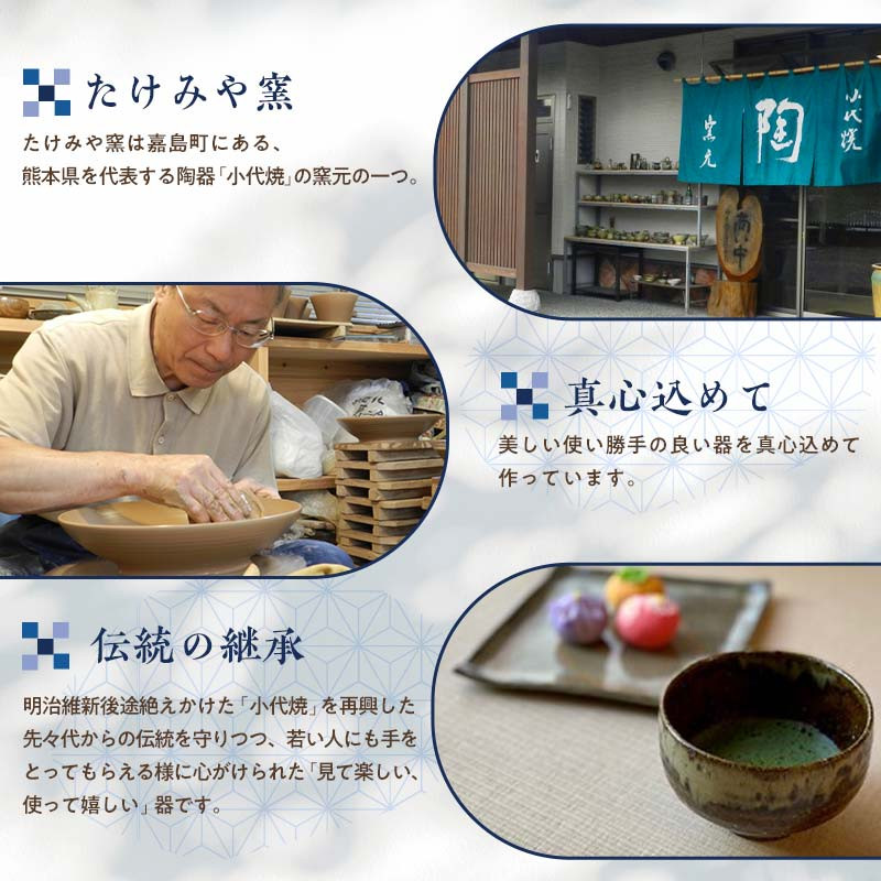 嘉島町にある「たけみや窯」で造られた『小代焼』。釉薬をかけ流した素朴な陶器は、味わい深い作風。明治維新後途絶えかけた『小代焼』を再興した先々代からの伝統を守りつつ、若い人にも手に取ってもらえるように心がけられた“見て楽しく、使って嬉しい”器です。