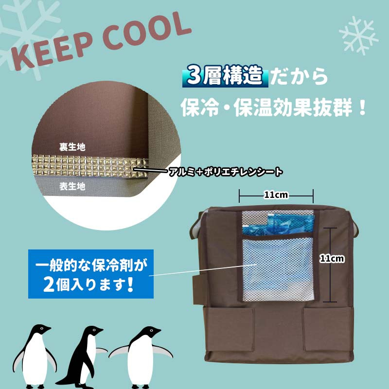 生地にアルミ+ポリエチレンシートを使用しており、保冷や保温も可能です。保冷剤用のメッシュポケットも付属しています。