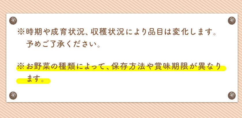 | 容量 | 【定期便】 月1回/3ヶ月(計3回) 旬の野菜・果物 10~15種類×3回 ■主な種類 季節の農産物(果物、野菜類)10~15種類 春:玉ねぎ、レタス、ほうれん草、アスパラガス、はっさく等 夏:長いも、ゴボウ、枝豆、ゴーヤ、ぶどう、オクラ等 秋:里芋、からいも、キャベツ、小松菜、ブロッコリー、柿等 冬:キャベツ、白菜、大根、れんこん、しょうが、温州みかん等 ※出荷時期に応じて旬の品種10~15種類をお届けします。 |