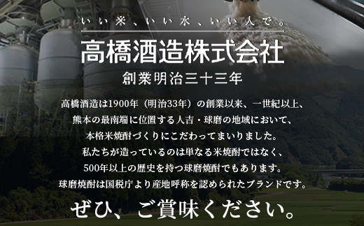 明治33年(1900年)創業の高橋酒造(現高橋ホールディング)は、球磨焼酎500年の伝統を重んじながら、「減圧蒸留法」という革新技術をいち早く取り入れ、現代の顧客のニーズに応じた米焼酎を造り続けてまいりました。