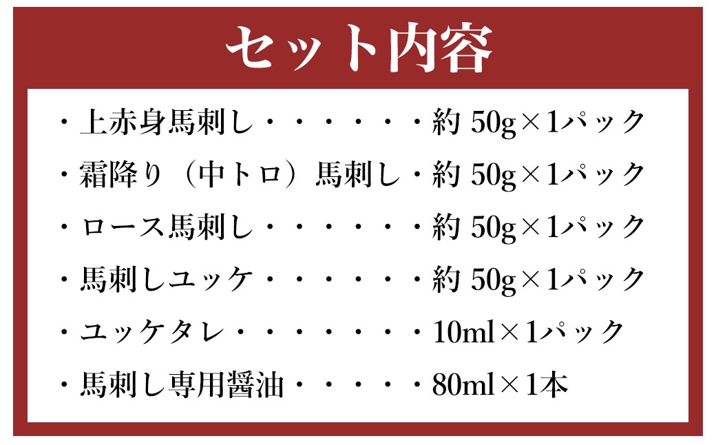 | 容量 | ・上赤身馬刺し(約50g×1パック) ・霜降り(中トロ)馬刺し(約50g×1パック) ・ロース馬刺し(約50g×1パック) ・馬刺しユッケ(約50g×1パック) ・ゆっけタレ(10ml×1本) ・馬刺し専用醤油(80ml×1本) 計:約200g |