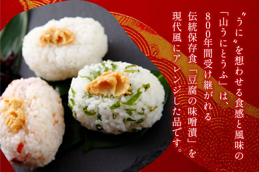 "うに"を想わせる食感と風味の「山うにとうふ」は、800年間受け継がれる伝統保存食「豆腐の味噌漬」を現代風にアレンジした温故知新の傑作品です。