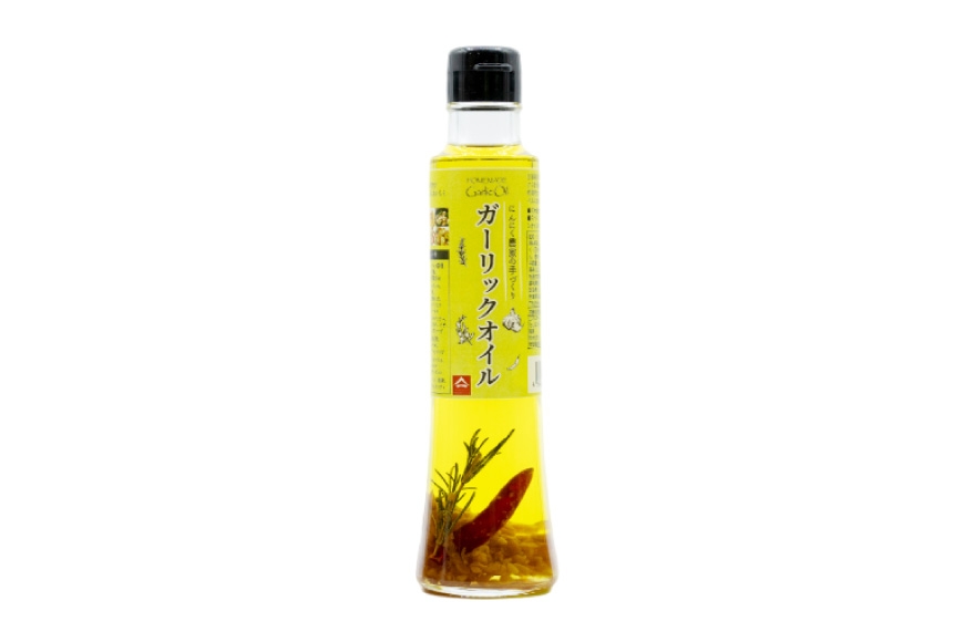 自家栽培のホワイト六片にんにくをエクストラバージンオイルで低温で一時間、じっくりと時間をかけて揚げ、にんにく風味を移しました。