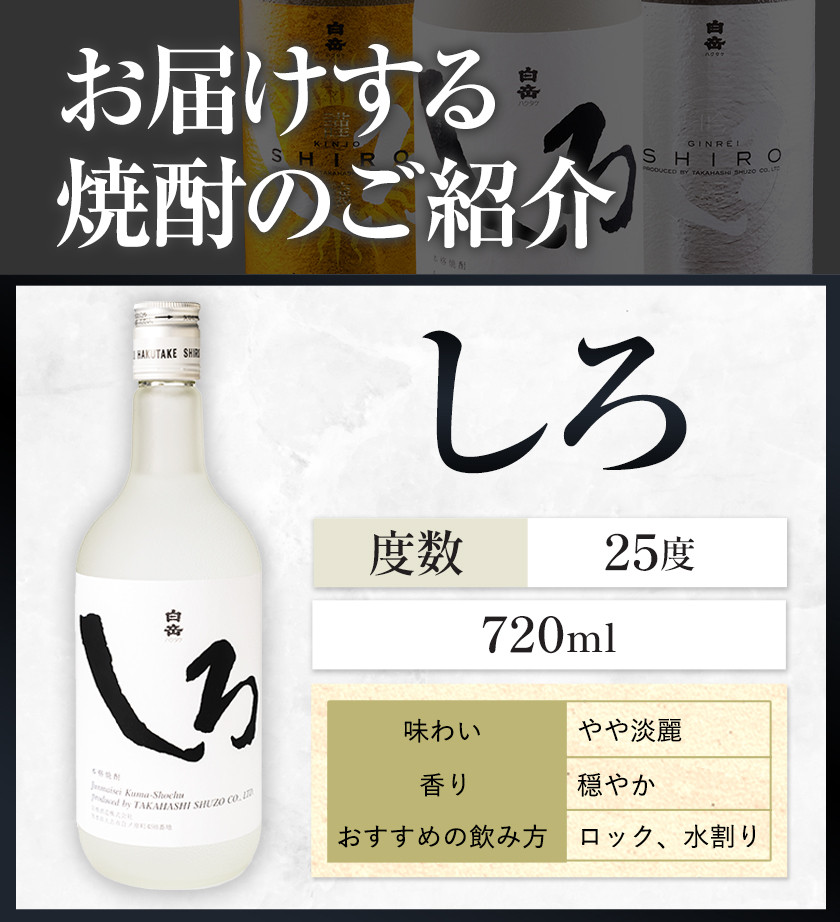 美味しいお米と美味しいお水でできた厳選球磨焼酎セット 白岳しろ 飲み比べセット 720ml×3本セット 球磨焼酎 25度 高橋酒造株式会社《30日以内に出荷予定(土日祝除く)》 飲み比べ 球磨焼酎 米焼酎 焼酎 酒 お酒 米 白岳 白岳しろ 銀しろ 金しろ 熊本県山江村 送料無料