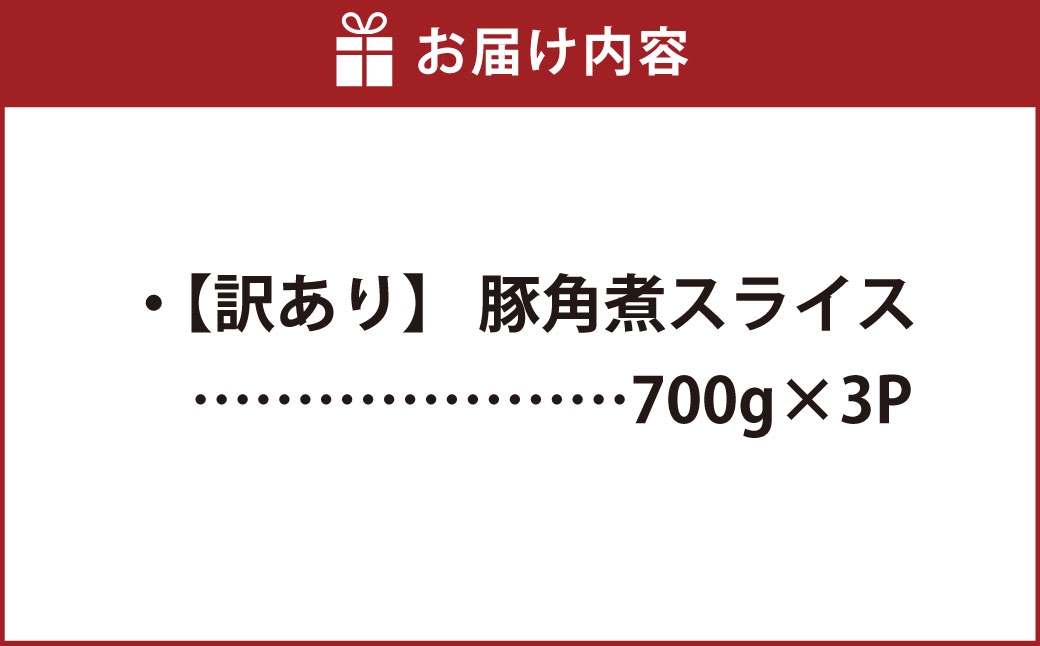 地域の生産者応援の品 豚角煮を食べやすいサイズにスライスした返礼品です。 【訳あり】 豚角煮 スライス 700g×3パック 計2.1kg 豚の角煮 角煮 豚肉 豚 冷凍