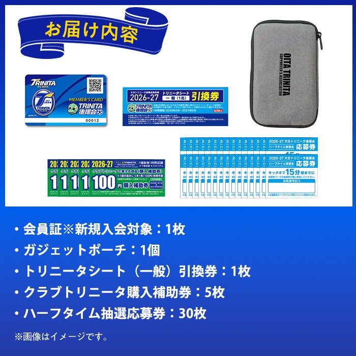 | 容量 | ・会員証※新規入会対象:1枚 ・ガジェットポーチ:1個 ・トリニータシート(一般)引換券:1枚 ・クラブトリニータ購入補助券:5枚 ・ハーフタイム抽選応募券:30枚 |