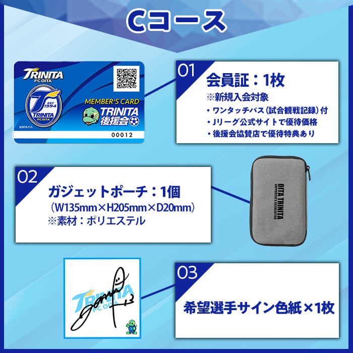 | 容量 | ・会員証※新規入会対象:1枚 ・ガジェットポーチ:1個 ・希望選手サイン色紙:1枚 ・トリニータシート(一般)引換券:2枚 ・クラブトリニータ購入補助券:5枚 ・ハーフタイム抽選応募券:40枚 |