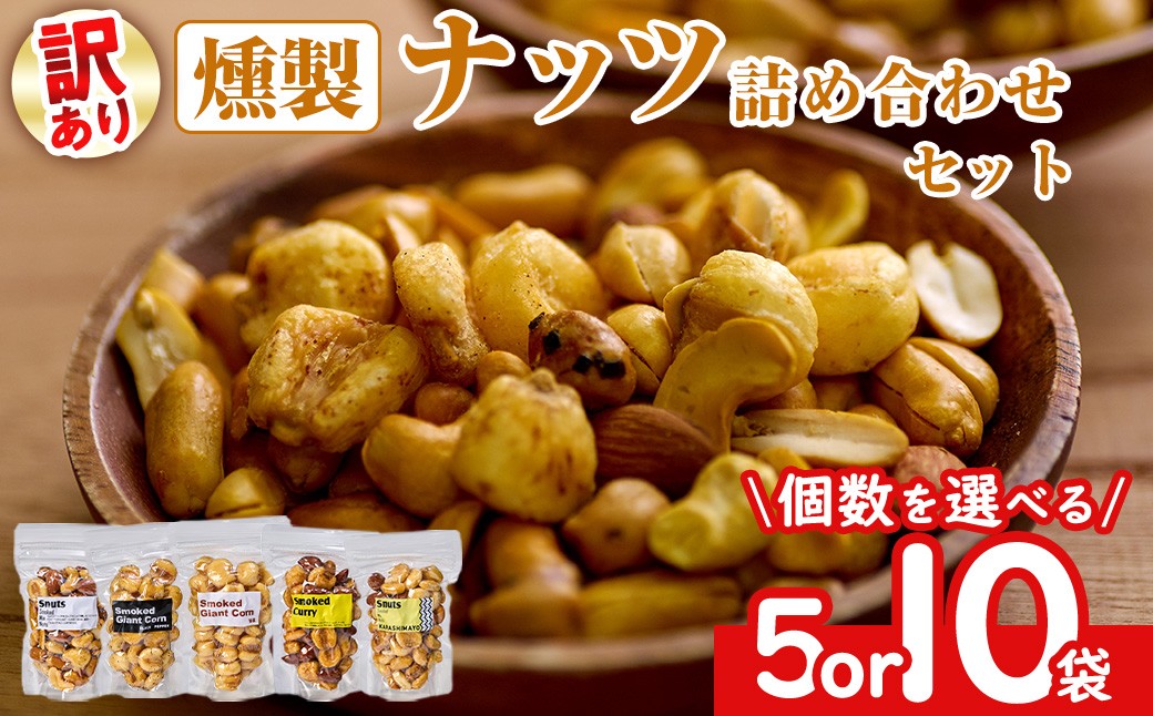 地域の生産者応援の品 地元の桜の木で燻した燻製ナッツ ふるさと納税 大分県 特産品 <内容量が選べる!> <訳あり ・ おまかせ> 燻製 ナッツ 詰め合わせ (計5袋 ・ 計10袋) ミックスナッツ ナッツ おやつ おつまみ 小分け 常温 保存 防災 防災食 【opaj001・opaj002】 【 希望の森 太陽農園】