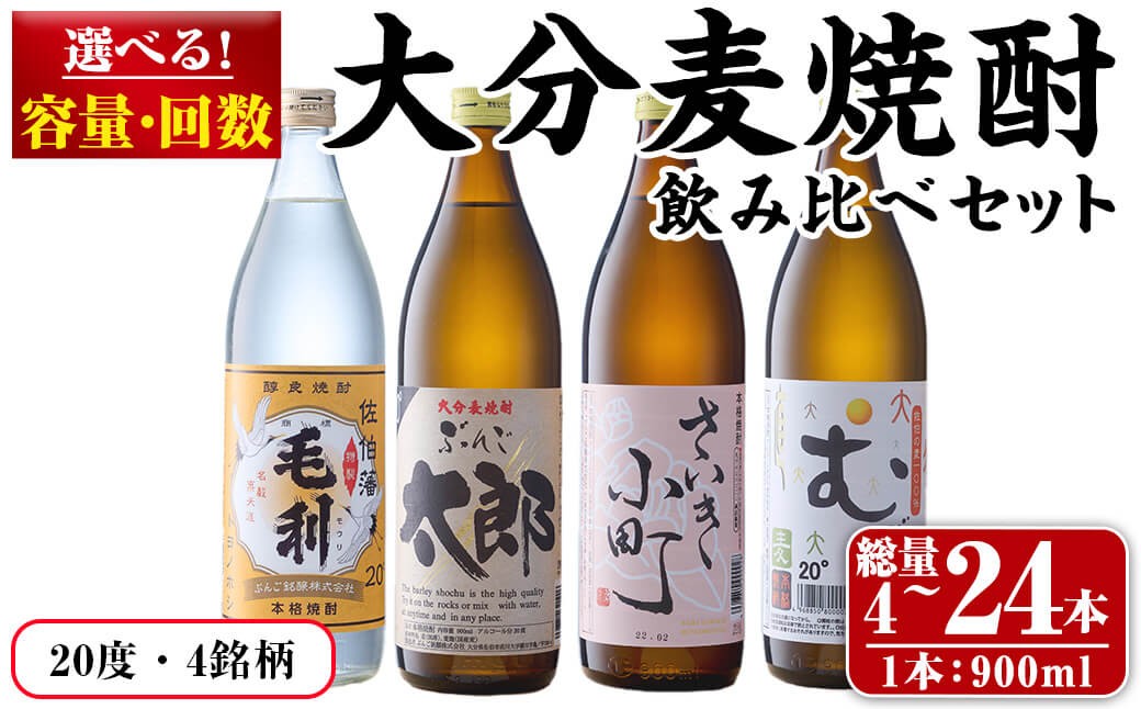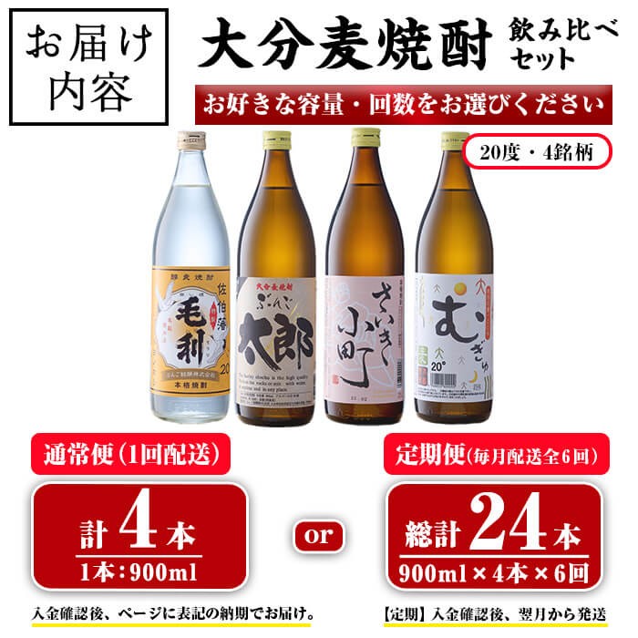 全国的にも珍しい20度の麦焼酎飲み比べセットです。 <お届け回数が選べる!> 大分麦焼酎 飲み比べセット (900ml×4本/ 1回~6回) 定期便 定期 飲み比べ セット 国産 毛利 ぶんご太郎 さいき小町 むぎゅ ご当地 焼酎 麦 20度 セット 酒 アルコール 【opax009・opax010】【ぶんご銘醸】