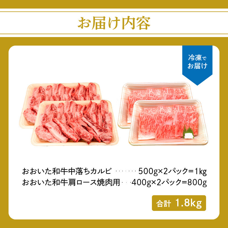 厳選したおおいた和牛中落ちカルビ・肩ロース焼肉用セットです。 厳選A4~A5等級 おおいた和牛 中落ちカルビ・肩ロース焼肉用セット 合計1.8kg 牛肉 和牛 カルビ 肩ロース 焼肉用 霜降り 厳選 中落ちカルビ 冷凍 大分県 A01128