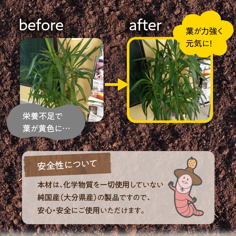 主原料はミミズ。ミミズに含まれている共生微生物で肥沃な土壌に生まれ変える天然由来の国産植物活性材です。