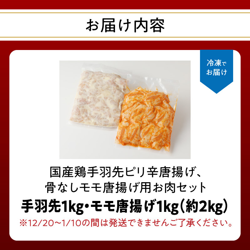 おかずやおつまみに、ご自宅で揚げて熱々をお召し上がりください。 大分のお肉屋さん「はしづめ」の国産鶏手羽先ピリ辛唐揚げ、骨なしモモ唐揚げ用お肉セット約2kg 唐揚げ から揚げ からあげ 手羽先 モモ肉 ピリ辛 国産 鶏 おかず おつまみ A03041