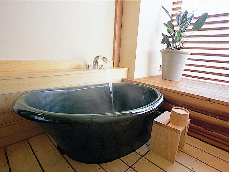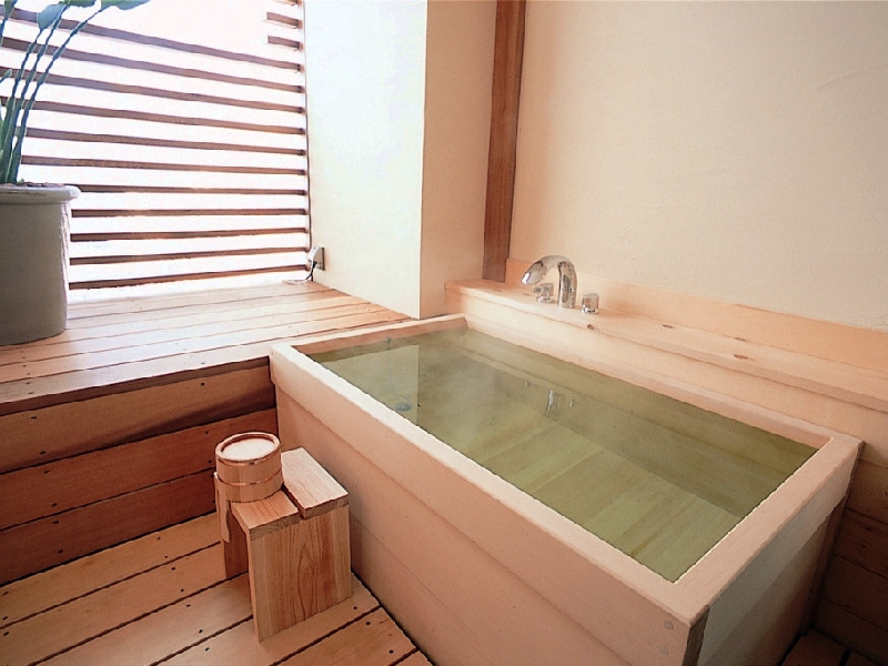 ヒノキ、陶器のどちらかの半露天風呂がお部屋についております。