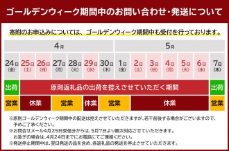 ●土日祝日、GW、年末年始の発送は原則行っておりません。