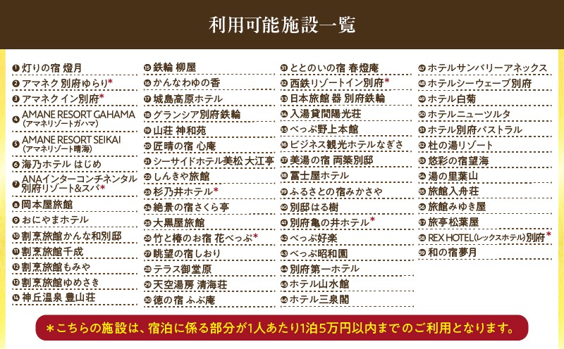 灯りの宿 燈月/アマネク 別府ゆらり(*)/アマネクイン別府(*)/AMANE RESORT GAHAMA(アマネリゾートガハマ)/AMANE RESORT SEIKAI(アマネリゾート晴海)/海乃ホテル はじめ/ANAインターコンチネンタル別府リゾート&スパ(*)/岡本屋旅館/おにやまホテル/割烹旅館かんな和別邸/割烹旅館千成/割烹旅館もみや/割烹旅館ゆめさき/神丘温泉 豊山荘/鉄輪 柳屋/かんなわゆの香/城島高原ホテル/グランシア別府鉄輪/山荘 神和苑/匠晴の宿 心庵/シーサイドホテル美松 大江亭/しんきや旅館/杉乃井ホテル(*)/絶景の宿さくら亭/大黒屋旅館/竹と椿のお宿 花べっぷ(*)/眺望の宿しおり/テラス御堂原/天空湯房 清海荘/徳の宿 ふぶ庵/ととのいの宿 春燈庵/西鉄リゾートイン別府(*)/日本旅館 器 別府鉄輪/入湯貸間陽光荘/べっぷ野上本館/ビジネス観光ホテルなぎさ/美湯の宿 両築別邸/冨士屋ホテル/ふるさとの宿みかさや/別邸はる樹/別府亀の井ホテル(*)/べっぷ好楽/べっぷ昭和園/別府第一ホテル/ホテル山水館/ホテル三泉閣/ホテルサンバリーアネックス/ホテルシーウェーブ別府/ホテル白菊/ホテルニューツルタ/ホテル別府パストラル/杜の湯リゾート/悠彩の宿望海/湯の里葉山/旅館入舟荘/旅館みゆき屋/旅亭松葉屋/REX HOTEL別府(*)/和の宿夢月