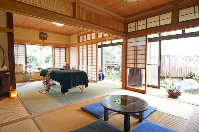 中庭に繋がるカウンセリングルームでは、季節のお茶、施術後のスイーツをお花と共に四季折々の鉄輪(かんなわ)の自然と温泉エステを楽しみながら日頃の疲れを癒してください。