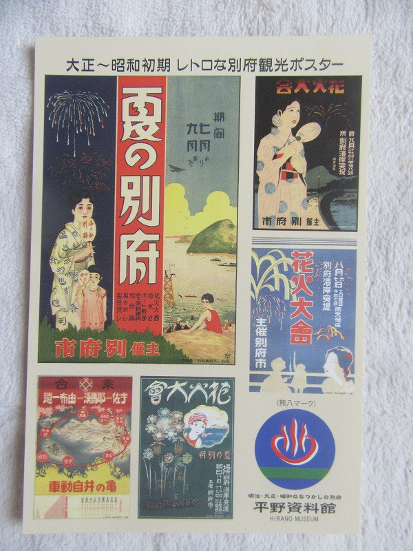 私設の別府温泉平野資料館には、大正昭和期の大変貴重な別府レトロポスターが保存されています。別府温泉を全国にPRするために手書きのポスターを制作してPRを行いました。平野資料館オリジナルグッズで大人気のレトロ絵葉書です。今から約100年前の大正昭和期に開催された花火大会、温泉祭、亀の井自動車、博覧会等で実際に使用された別府ポスターを絵葉書にしています。