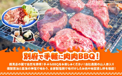 ふるさと納税 肉 バーベキュー 体験 チケット 手ぶら BBQ 炭火 天然食材 牛肉 豚肉 鶏肉 ウインナー 野菜 地獄蒸し たまご 炭 燻製醤油 森海の神塩 温泉 足湯 源泉かけ流し 大分県