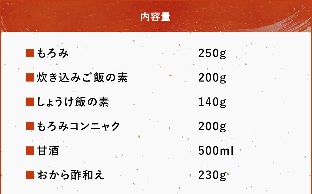 | 容量 | もろみ250g/炊き込みご飯の素200g/しょうけ飯の素140g/もろみコンニャク200g/甘酒500ml/おから酢和え230g/耶馬美人720ml/耶馬渓茶玄米茶170g 【原材料】 ●もろみ:大豆、醤油、米麹、小麦、みりん(もち米、醸造アルコール、糖類) ●炊き込みご飯の素:しょうゆ(大分県製造)、干しシイタケ、鶏肉、人参、ゴボウ、砂糖、みりん(もち米(ベトナム産))米麹、一部に小麦大豆を含む) ●しょうけ飯の素:しょうゆ(大分県製造)、干しシイタケ、鶏肉、人参、ゴボウ、砂糖、みりん(もち米(ベトナム産))米麹、一部に小麦大豆を含む) ●もろみコンニャク:こんにゃく(国産)、もろみ醤油、砂糖、発酵調味料、原材料の一部に小麦、大豆を含む ●甘酒:白米、米麹、餅米、塩 ●おから酢和え:大豆(国産)、酢、砂糖、魚肉てんぷら(卵含む)、人参、ネギ、しょうゆ、塩/加工でん粉、調味料(有機酸など) ●耶馬美人:米、米麹、アルコール分25% ●耶馬渓茶玄米茶:緑茶、玄米 |